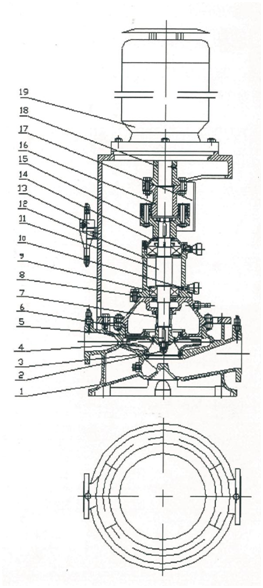 1.泵体 2.叶轮螺母 3.密封环 4.叶轮 5.键 6.泵盖 7.机械密封 8.油封 9.轴承 10.旋盖式油杯 11.轴 12.轴承体 13.旋液分离器 14.压盖 15.泵联轴器 16.中间联轴器 17.护罩 18.电机连接法兰 19.电机